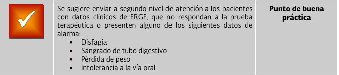 ¿ Cuáles son las indicaciones de envio a segundo nivel de atención para panendoscopia a pacientes con datos de ERGE ?