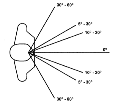 between 40° below the standard line of sight, and 30° above the standard line of sight.