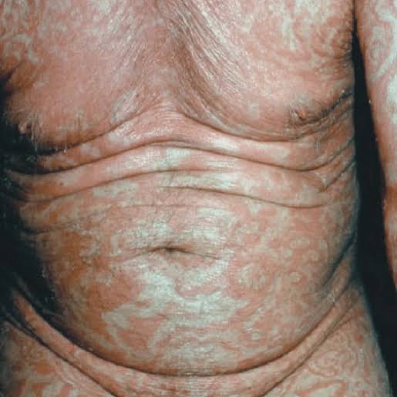 O achado de vasos da derme envoltos por manguitos composto por linfócitos, histiocitoses e ocasionalmente eosinofilos é encontrado em qual doença?