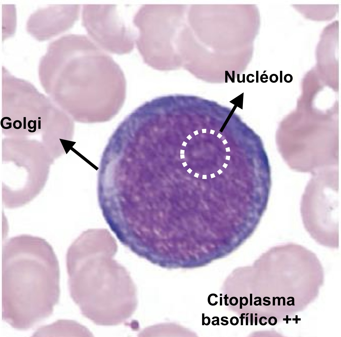 Citoplasma: Intensamente basofílico com halo claro ao redor do núcleo. Pode apresentar Golgi. Pode exibir extrusões citoplasmáticas (seta)
