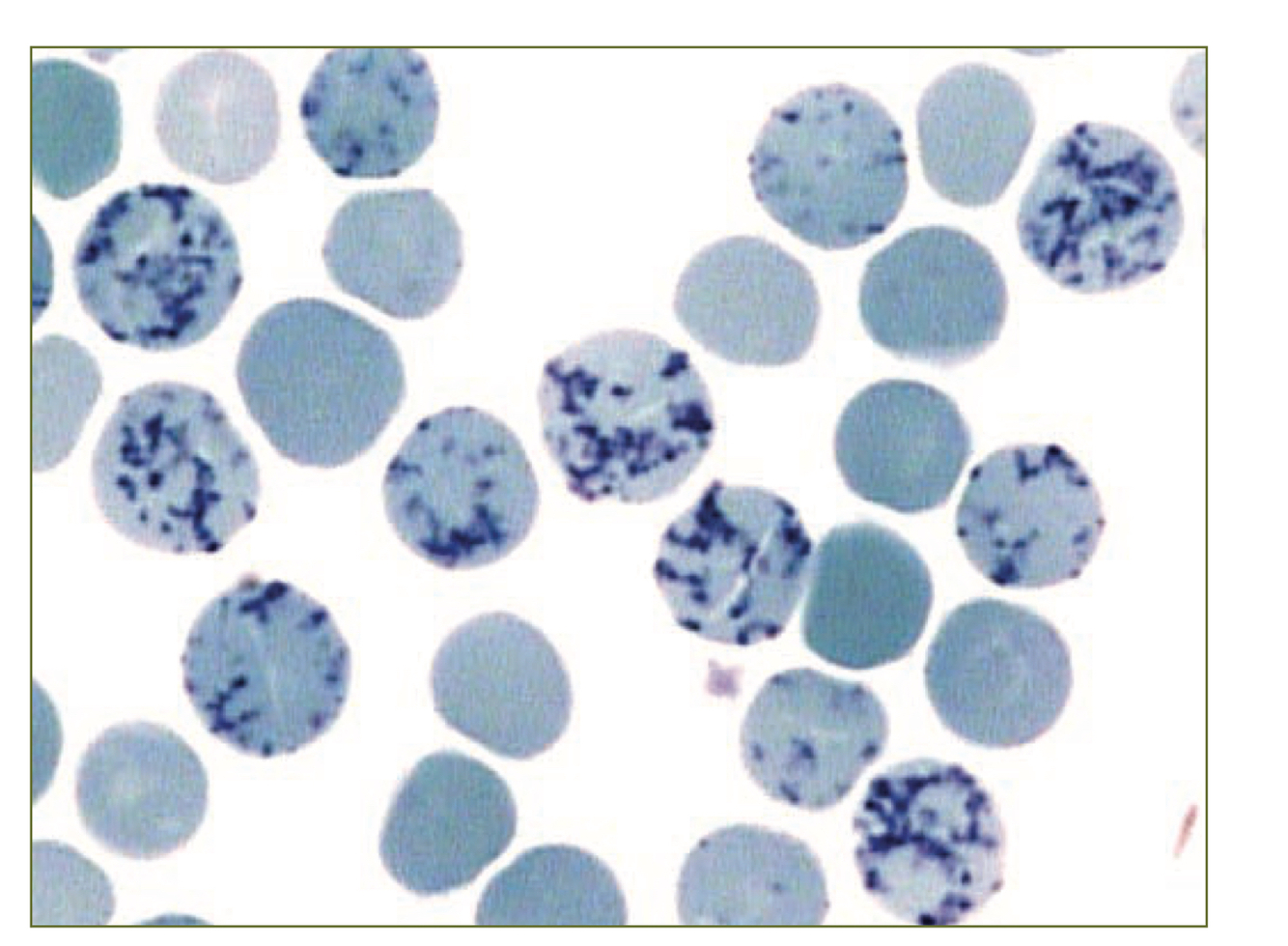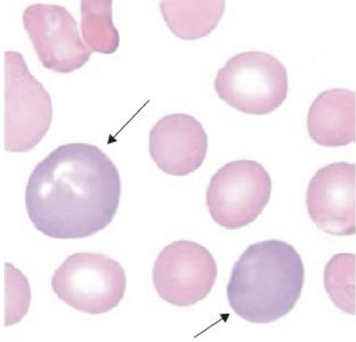 A hemácia policromática pode representar reticulócitos na coloração habitual. Os reticulócitos apresentam vestígios de RNA após a expulsão do núcleo, tornando a célula mais basofílica que uma hemácia normal, mas sem nucleo para diferenciar de eritroblasto ortocromático (já expulso).