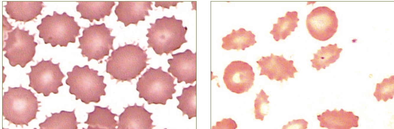 No ESP destacam-se pela coloração intensa laranja-vermelho e por não formarem rouleaux eritrocitário. Além disso, apresentam aspecto redondo bem formado