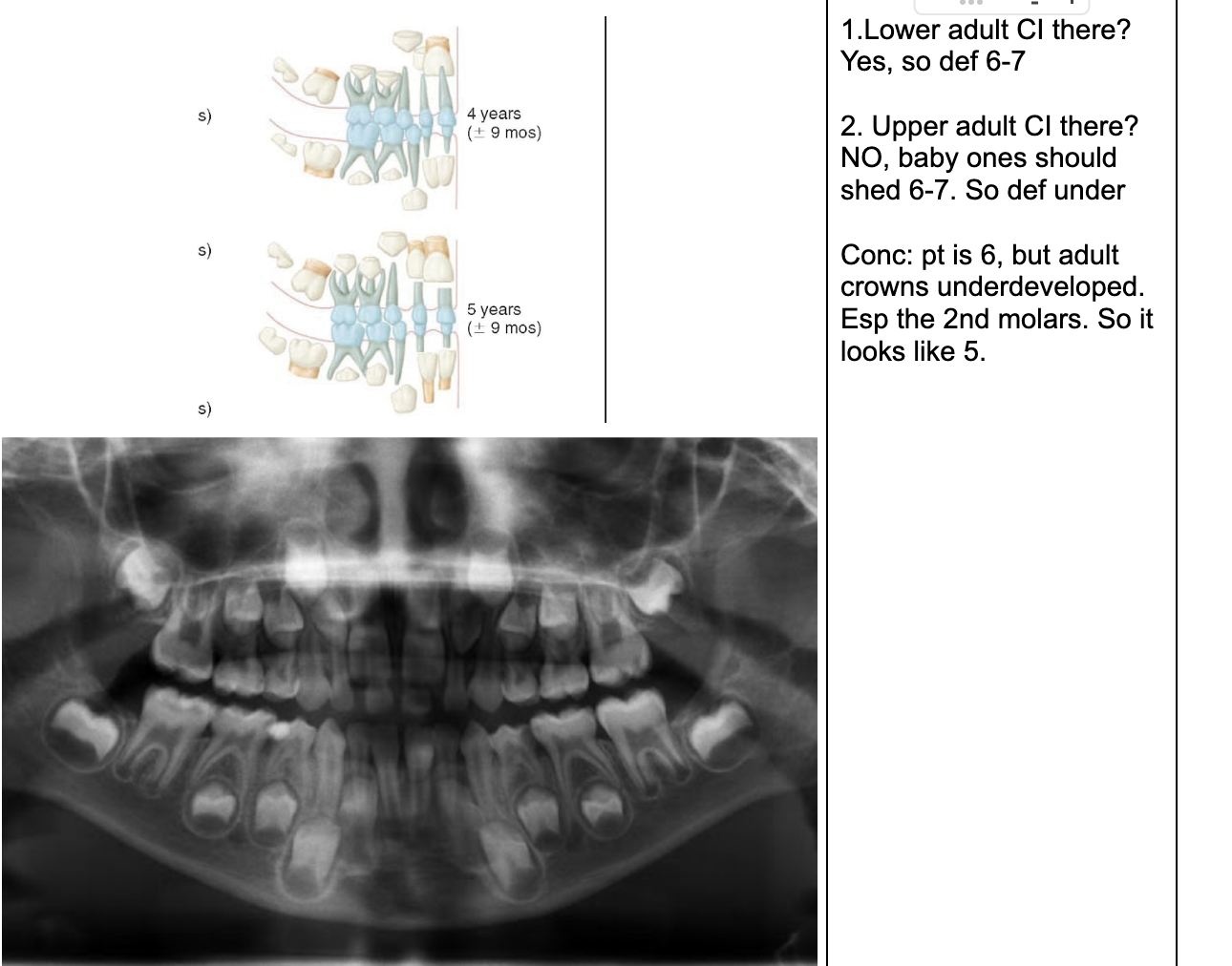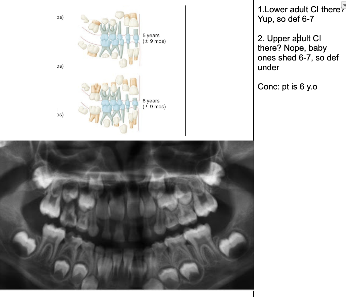 Permanent lower incisors present? Yes, so definitely 6-7