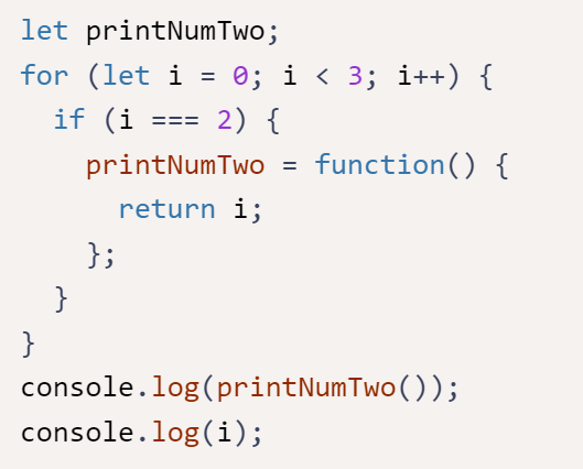 It will return “2” because three different i variables with unique values (0, 1, and 2) were created by the let keyword within the loop statement only; and throw an error that i is not defined because i was not declared in the global scope. It is only declared within the for loop statement.
