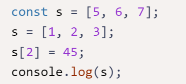 s = [1, 2, 3] will result in an error. The console.log will display the value [5, 6, 45].