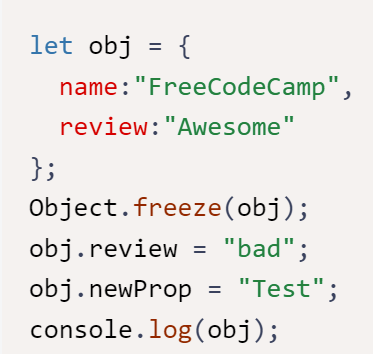 In the code, below, the obj.review and obj.newProp assignments will result in errors, because our editor runs in strict mode by default, and the console will display the value { name: “FreeCodeCamp”, review: “Awesome” }.