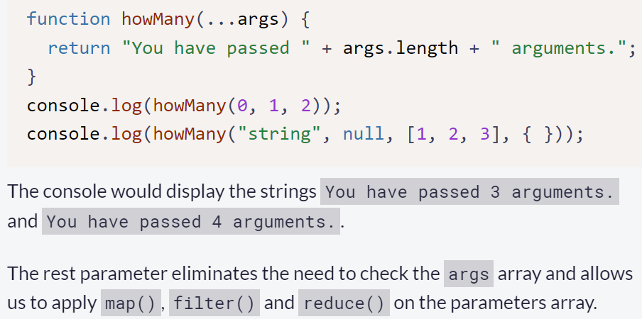 An ES6 syntax that allows us to pass as many arguments as we want into a funtion. These arguments are stored in an array that can be accessed later from inside the function.