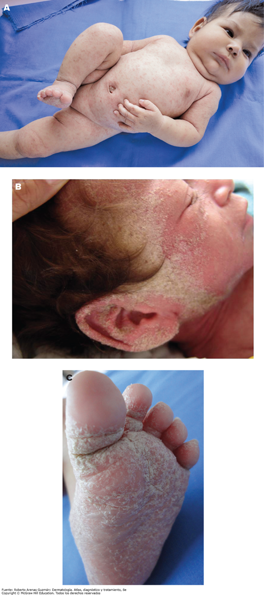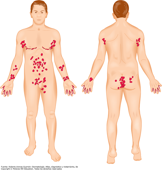 Lesiones predominan piel cabelluda, palmas de las manos, plantas de los pies y pliegues.