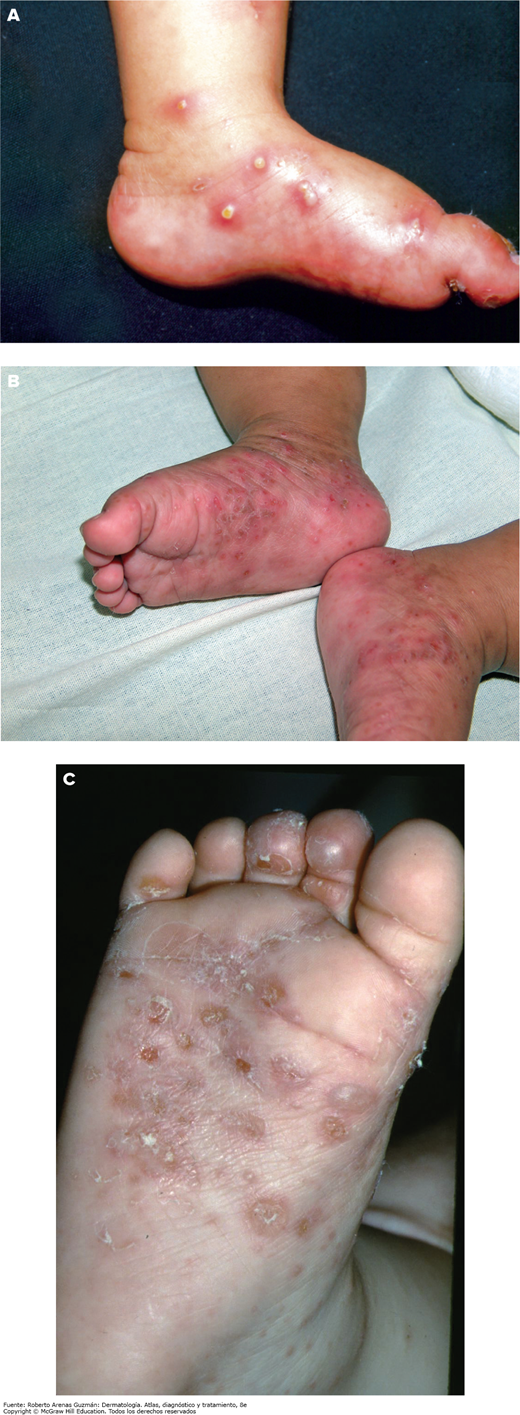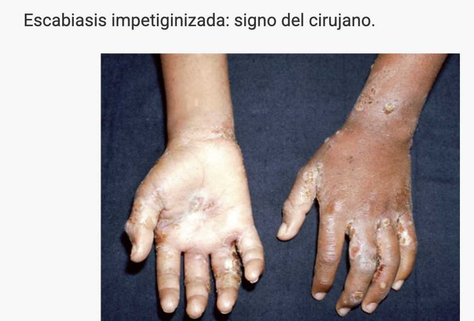 En los niños suele haber pústulas y costras melicéricas en los dedos, lo que impide cerrar las manos (signo del cirujano)
