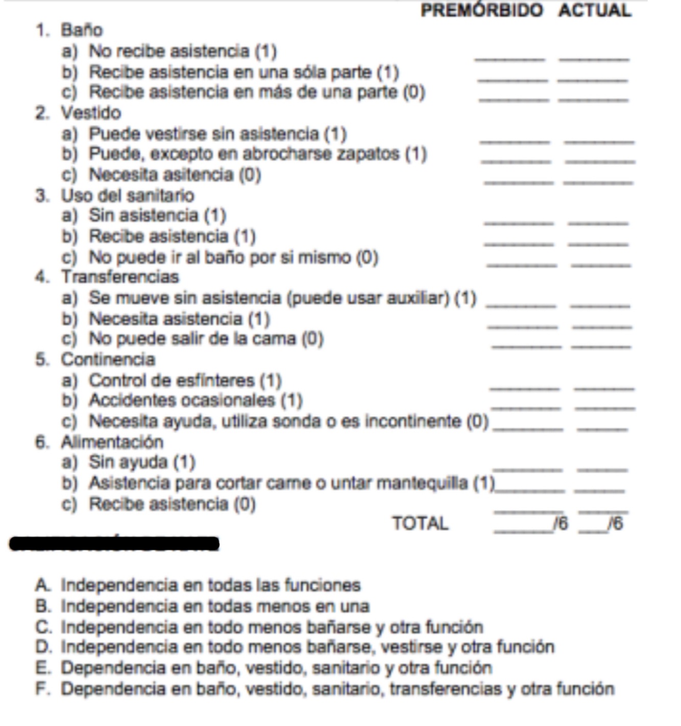 Escala de ABVD indice KATZ, sirve para medir la independencia del adulto mayor en las actividades básicas diarias y permite evaluar si el px necesita un cuidador 12 o 24 hrs.