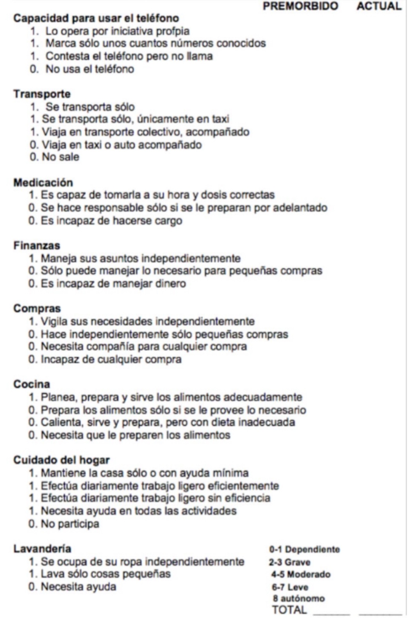 Escala de Lawton y Brody, nos sirve para evaluar las actividades instrumentales de la vida diaria ya que estas son las primeras implicadas en el deterioro cognitivo