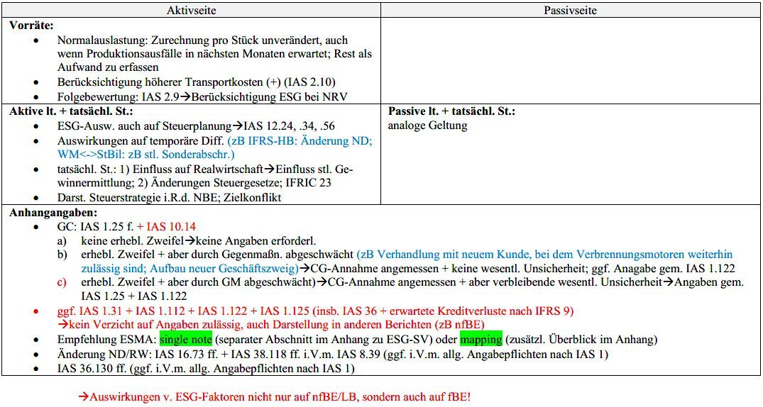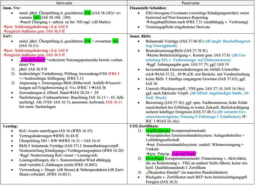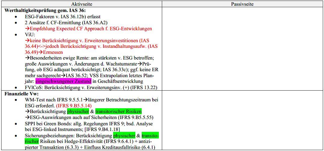 Wie werden ESG-bezogene Aspekte bei IFRS-Abschlussen berücksichtigt? Nenne die Auswirkungen getrennt nach Bilanzposten: