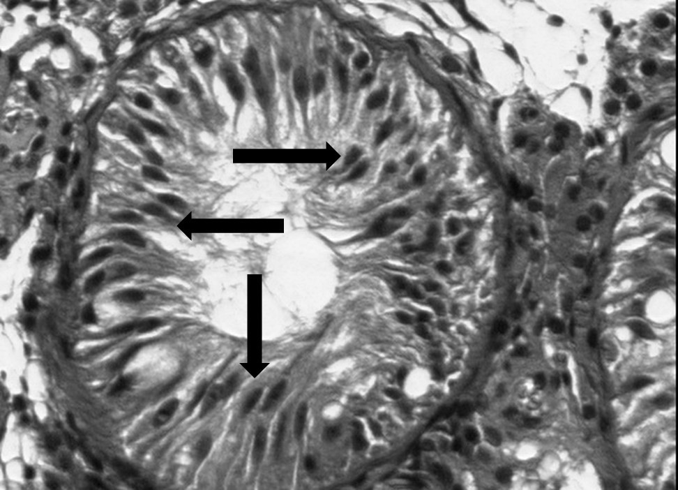 This is a cross-section of a seminiferous tubule. Which cells do the arrows point to?