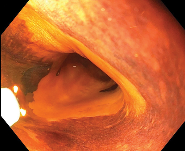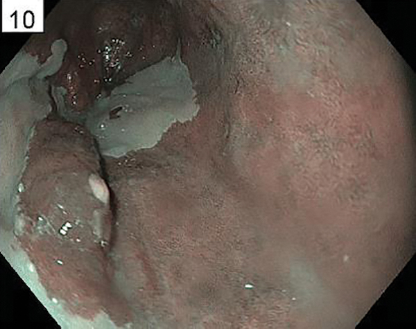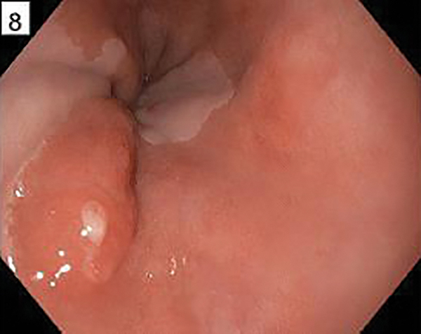 The lesion above shows a 4-cm circumferential non-staining area. Endoscopic mucosal resection of such a long, circumferential area of squamous neoplasia has a high risk of stricturing. After staining with Lugol’s iodine, it is the non-staining, not the staining areas, which are likely to be neoplastic. RFA of this lesion results in complete eradication of neoplasia in >80% of patients in most studies. Ablation for squamous epithelium can be successfully performed at energy densities lower than that used for columnar epithelium, to reduce the risk of stricturing.