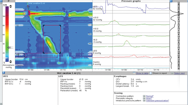 This patient’s manometric tracing showing an esophageal aperistalsis and a hypotensive lower esophageal sphincter (LES) is consistent with scleroderma–an autoimmune disease of the connective tissue. Esophageal dysmotility develops as the smooth muscles of the esophagus are replaced by scar tissue; smooth muscles atrophy and fibrosis occurs. Symptoms may often include severe heartburn, regurgitation, and dysphagia. Erosive esophagitis is observed in as many as 60% of patients, and the incidence of Barrett’s esophagus and adenocarcinoma of the esophagus is increased. Dysphagia is usually due to diminishing peristalsis, peptic strictures, or a combination of both. Pulmonary involvement either as a primary manifestation or secondary to acid reflux and aspiration may also be present. The classical manometric abnormalities include low LES pressure and low amplitude or absent peristaltic contractions in the distal esophagus. The primary treatment is aimed at controlling GERD and the primary disease.