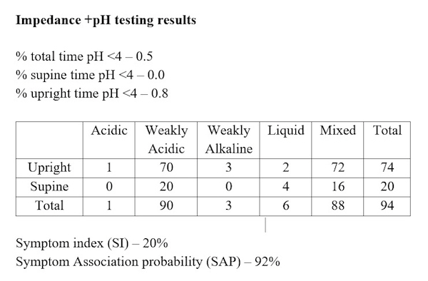 Wireless pH testing off medications is performed, with a tracing shown in the figure.