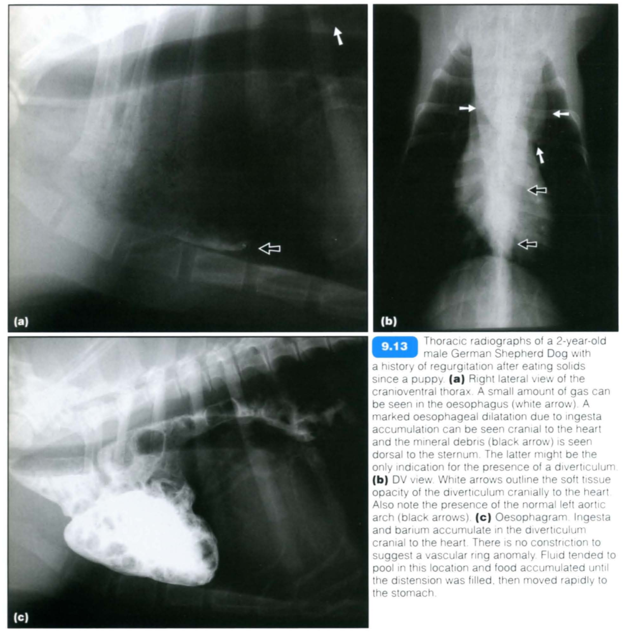Oesophageal diverticula are rare pouch-like sacculations of the oesophageal wall that may be congenital (Figure 9.13) or acquired. Congenital diverticula occur most often in medium-sized to small-breed dogs. Clinical signs of diverticula are related to the underlying oesophageal disease or to local food stasis and inflammation.