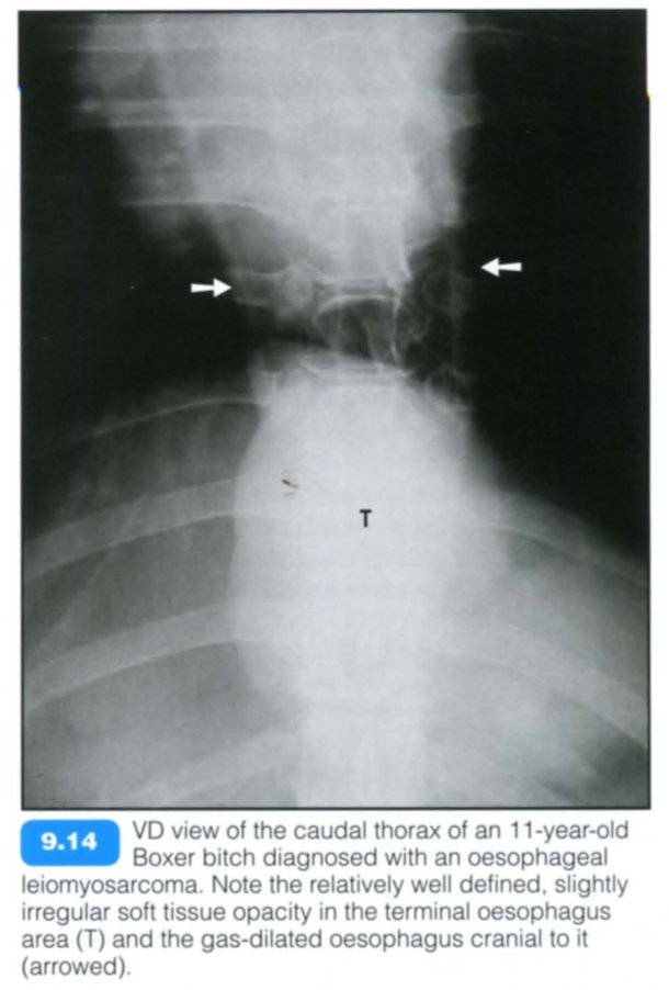 Fibrosarcoma and osteosarcoma developing from malignant transformation of Spirocerca lupi granulomas (see below) are the most common malignant oesophageal neoplasms in dogs. Other oesophageal neoplasms are extremely rare and constitute less than 0.5% of all cancers in the dog and cat. These may be of primary oesophageal, perioesophageal (lymph nodes, thyroid, thymus and heart base; see Chapter 8) or metastatic (thyroid, pulmonary and gastric carcinomas) origin.