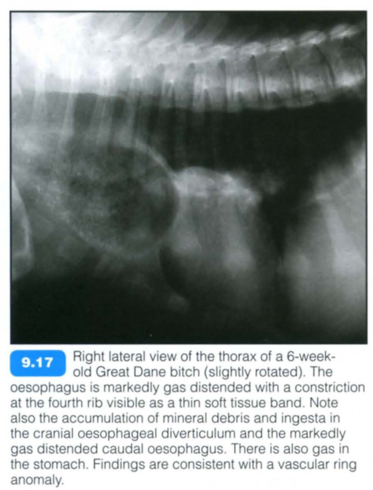 Vascular ring anomalies are congenital malformations of the major arteries of the heart that entrap the intrathoracic oesophagus and cause oesophageal obstruction. The condition is likely to be heritable in German Shepherd Dogs, Irish Setters and Greyhounds. Vascular ring anomalies are uncommon in the cat.