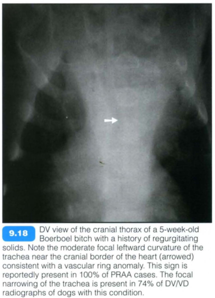 Certain clinical signs are similar in all vascular ring anomalies. Most animals present as thin and stunted with a history of regurgitation of solid foods at the time of weaning. Rarely, the ductus arteriosus may remain patent in PRAA (corresponding radiographic signs of patent ductus arteriosus (PDA) should be looked for) and can be auscultated with its characteristic machinery or continuou s murmur. Patients with double aortic arch anomalies may be dyspnoeic due to concomitant entrapment of the trachea.