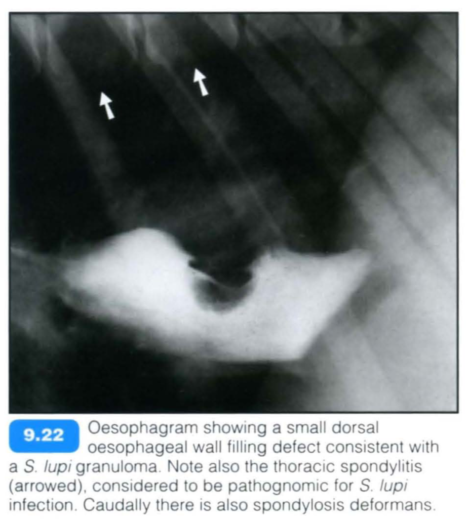 The nematode Spirocerca lupi may lead to the development of oesophageal granulomas and neoplasms. The condition is common in endemic areas (most tropical and subtropical countries) but otherwise very rare. Although any breed can be affected , the condition is seen more commonly in large-breed dogs. Infections in cats are seldom reported.