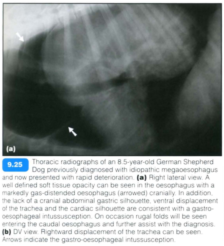 Gastro-oesophageal intussusception is a condition and results from invagination of the stomach, with or without other abdominal viscera (spleen, duodenum, pancreas and omentum), into the caudal oesophageal lumen.