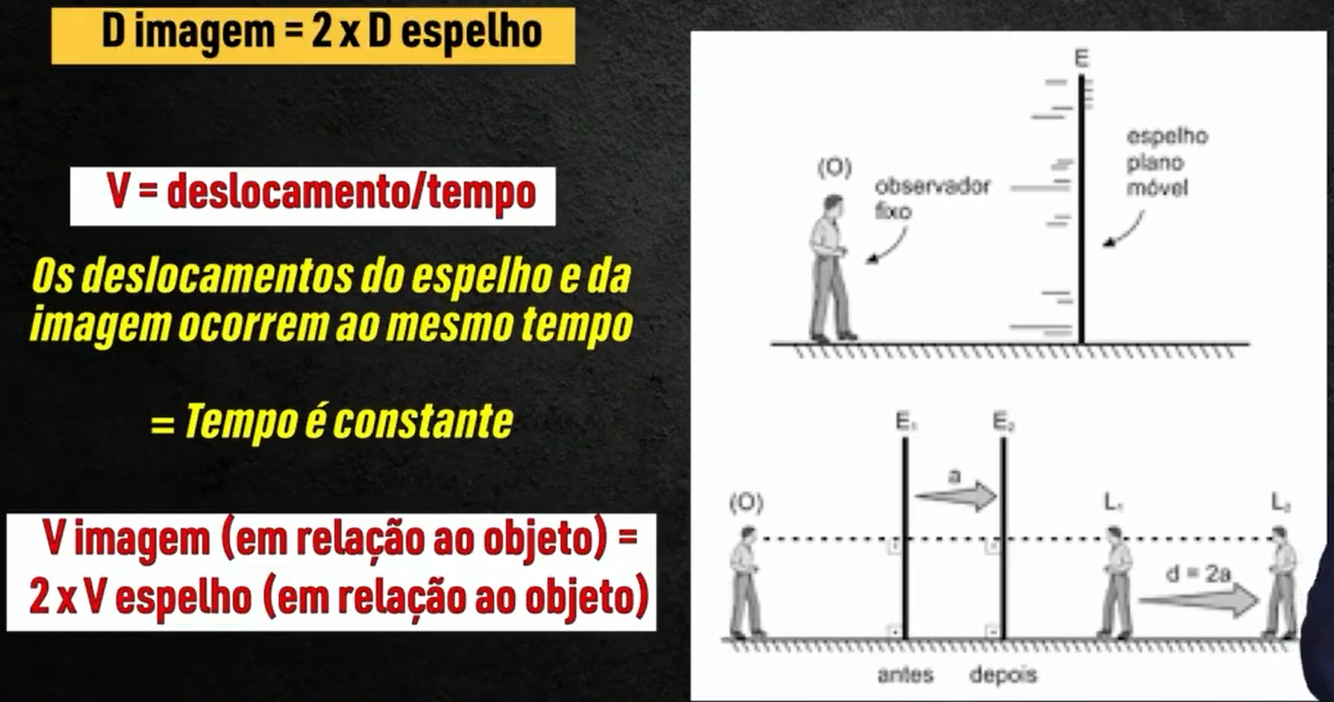 Quando espelho se afasta do objeto uma distância D, o deslocamento da imagem em relação ao objeto é 2xD.