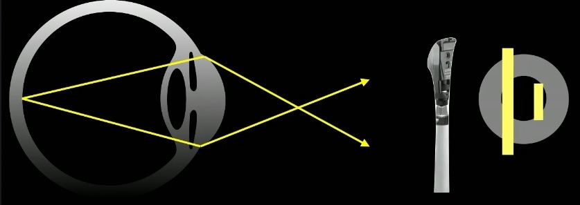 Como não podemos realizar o exame do infinito, os raios deixam o Retinoscópio com vergência negativa (divergindo).