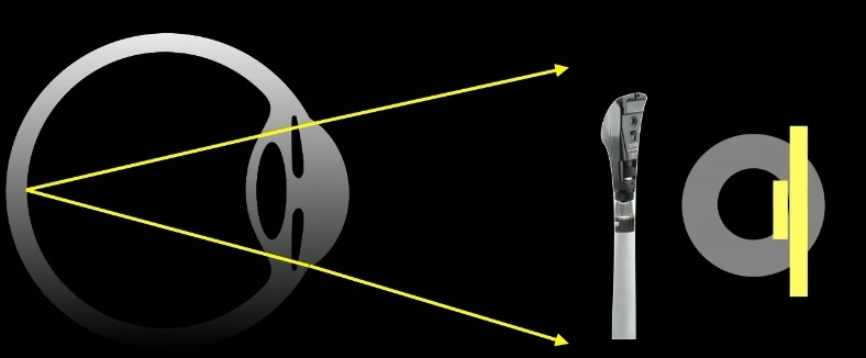 Os raios cruzaram na frente do examinador, portanto, deixaram o olho com vergência positiva → Olho com poder positivo grande