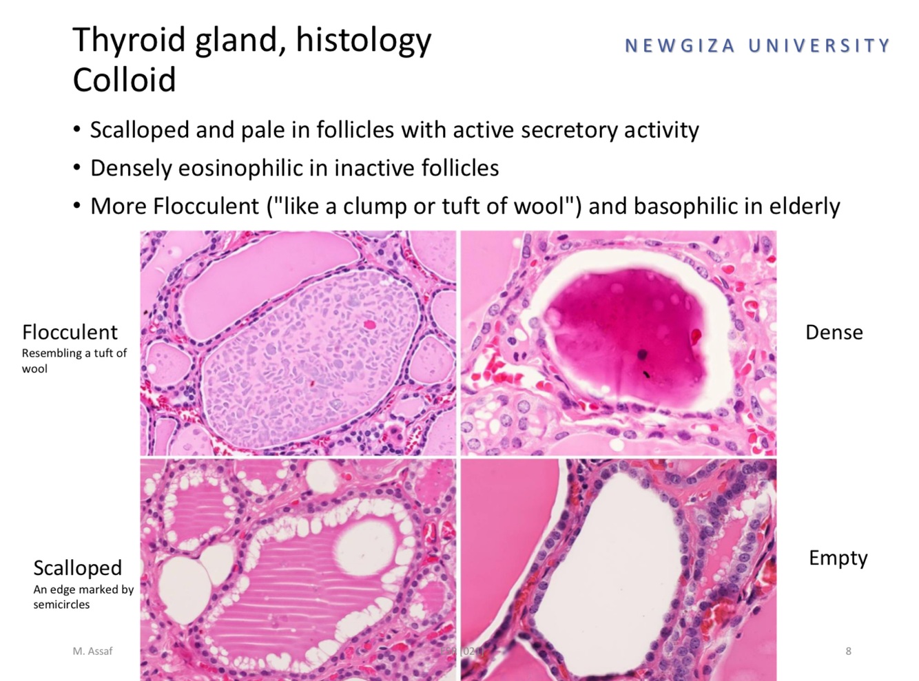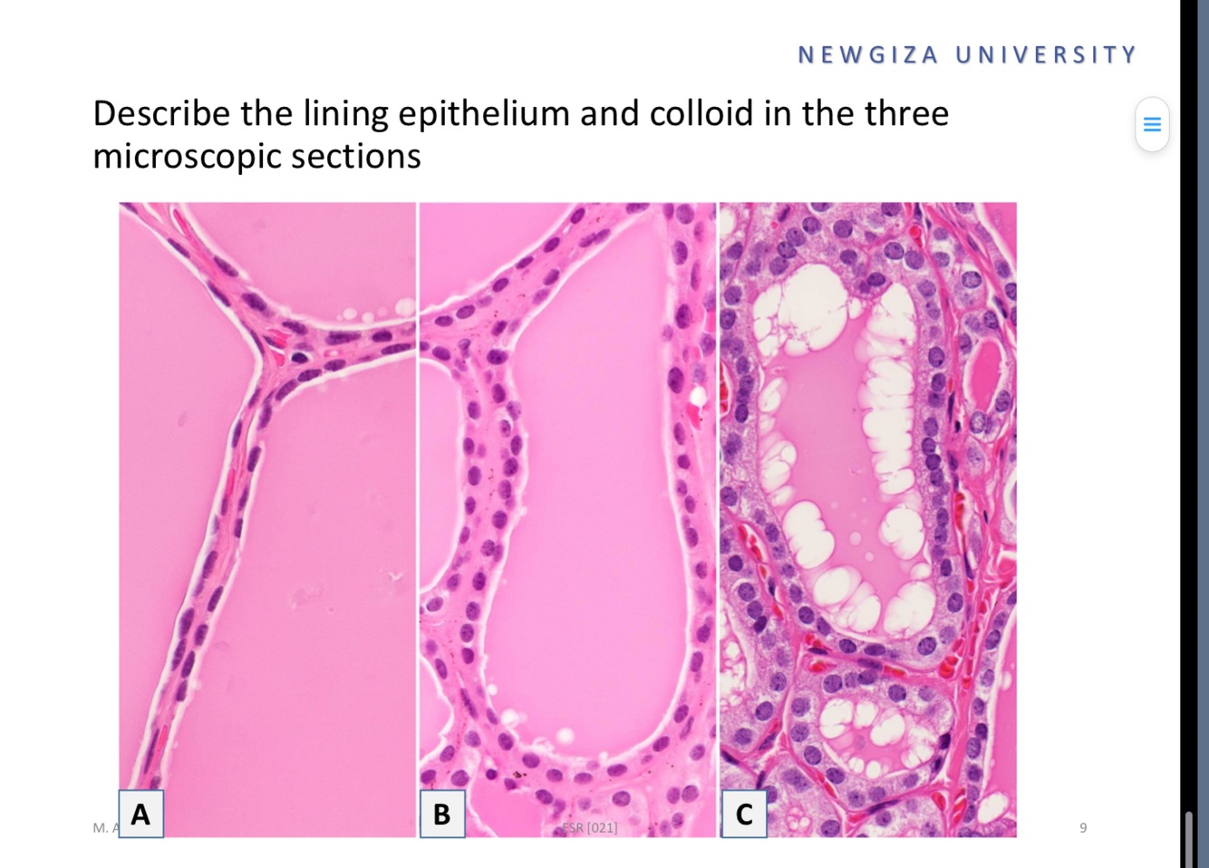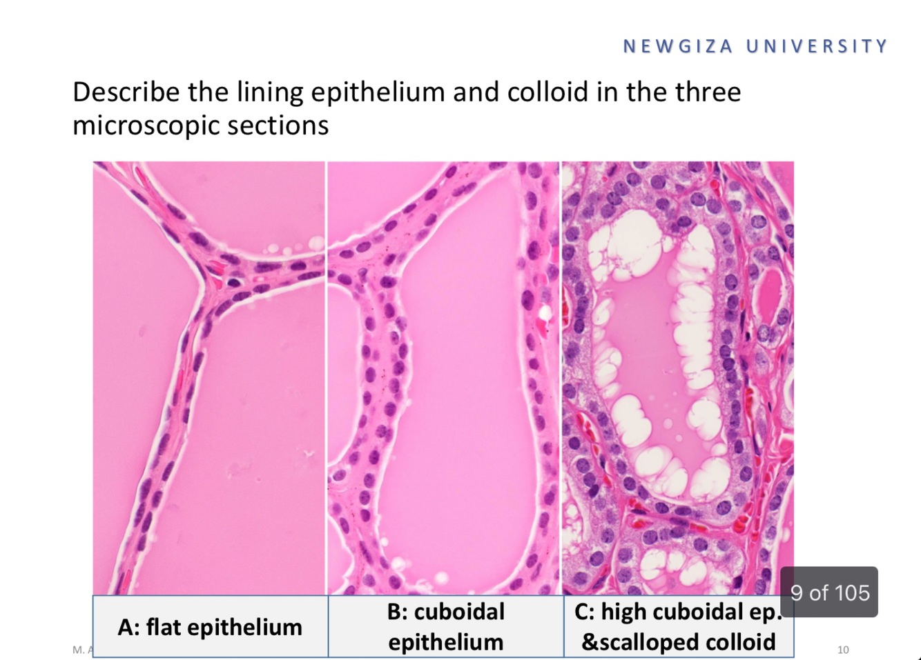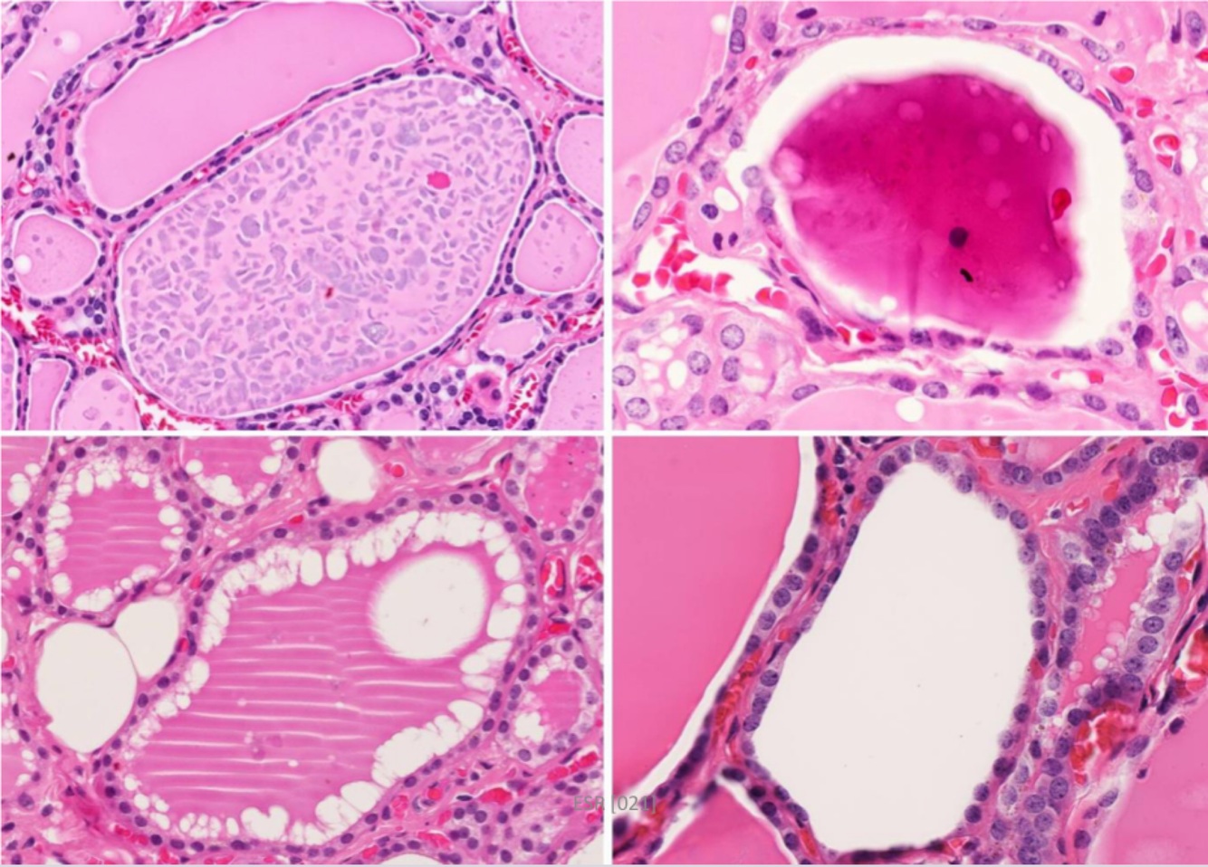 Figure illustrates 4 histological variations of Thyroid follicele appearance , define each one
