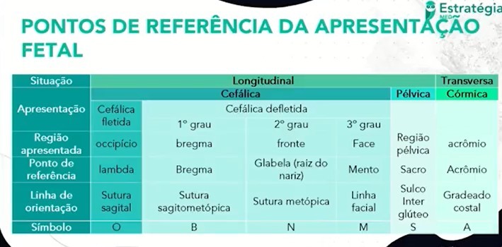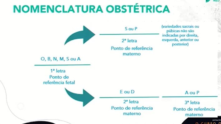 A primeira letra diz respeito ao ponto de referência da apresentação fetal: O (occipício), B (bregma), N (naso), M (mento), S (sacro) e A (acrômio).