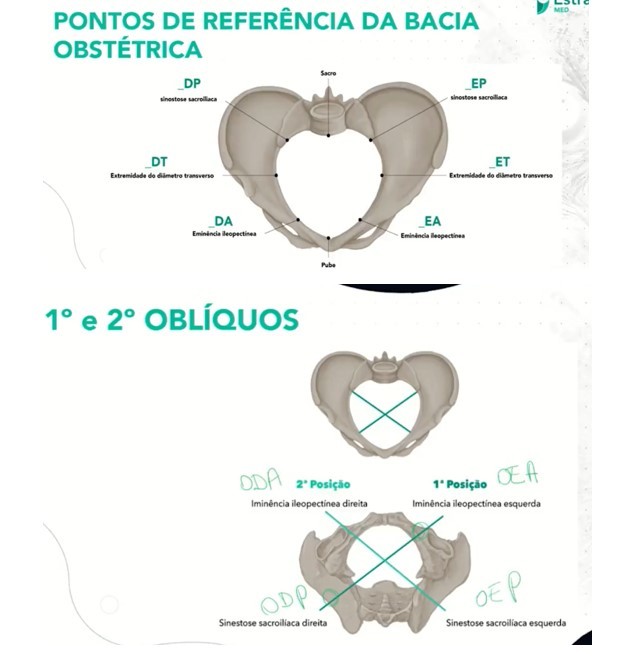 Quais são os pontos de referência da Bacia Obstétrica? Quais são o 1o e 2o oblíquos?