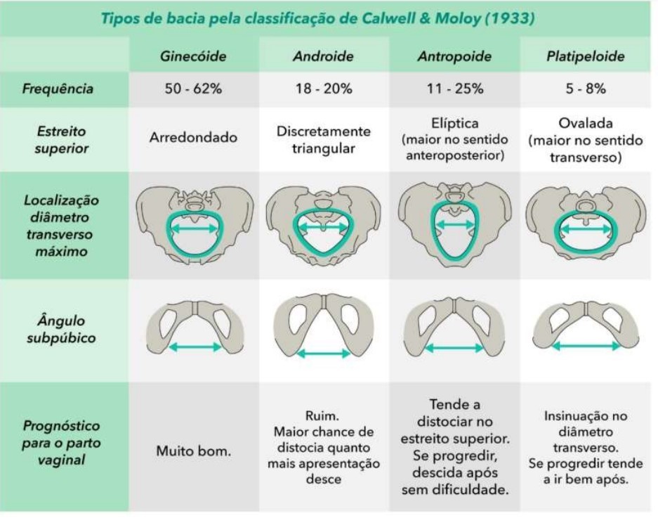 Quais são os 4 tipos de bacia obstétrica e quais são seus prognósticos?