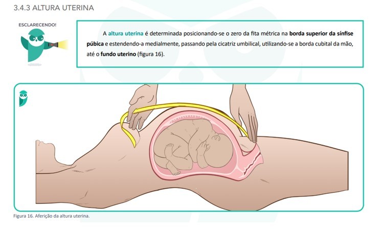 Posicionar o 0 da fita métrica na BORDA SUPERIOR da Sínfise Púbica. Vai passar a fita pela CICATRIZ UMBILICAL até o fundo do uterino.