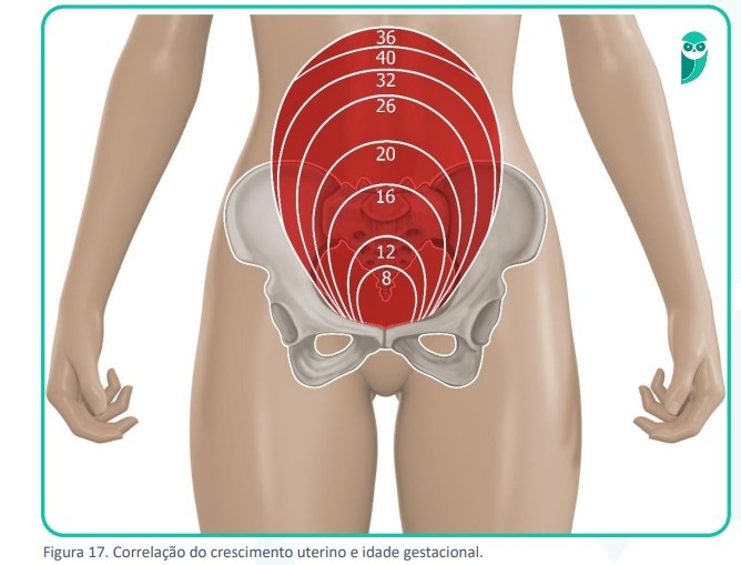 O útero: • deixa de ser um órgão pélvico por volta da oitava semana de gestação; • atinge a altura da cicatriz umbilical por volta da 20ª semana; e • a partir da 20ª semana, cresce cerca de 1 cm por semana, correlacionando-se com a idade gestacional até próximo do termo.