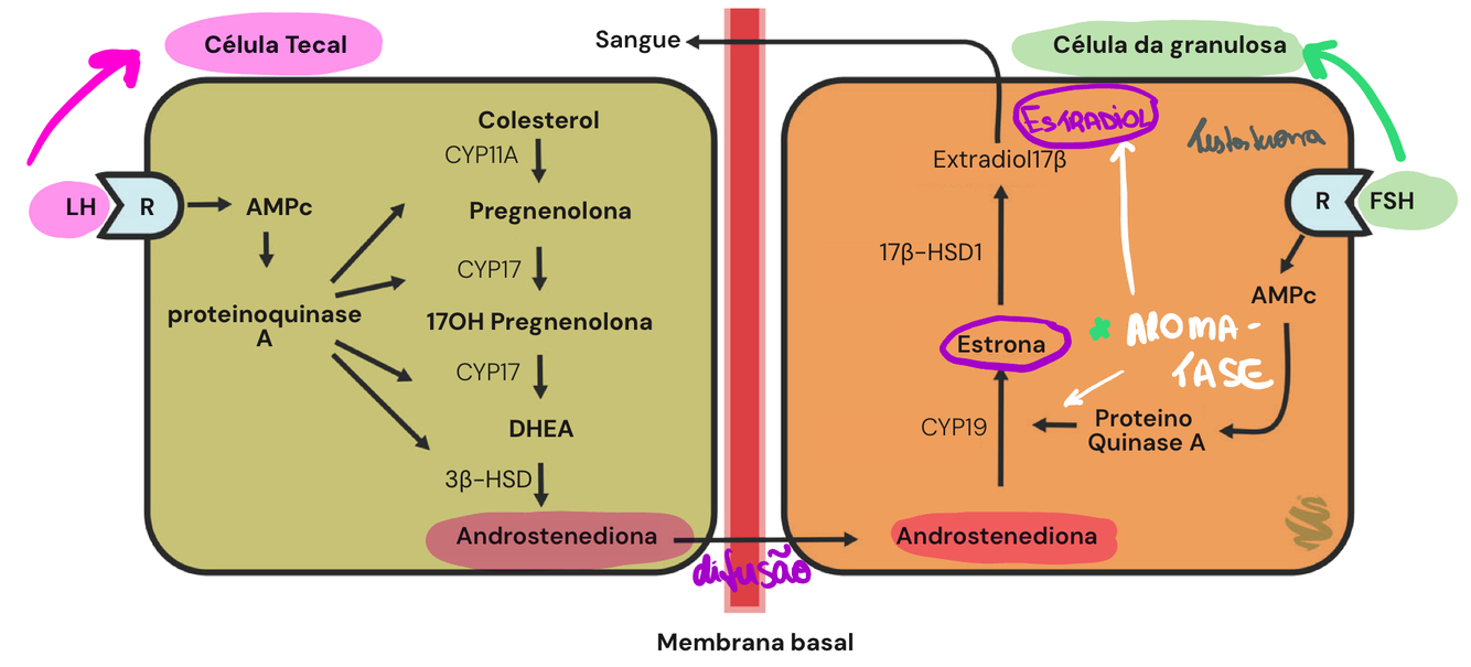 Qual é a teoria das duas células ovarianas? O que elas produzem? Qual o estimulo para cada uma?