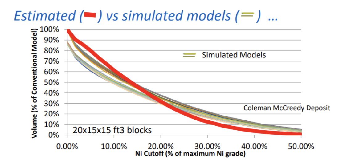 Estimated models (Red) Overestimates low-grades AND Underestimated high-grades, comparatively to simulated models.