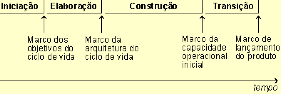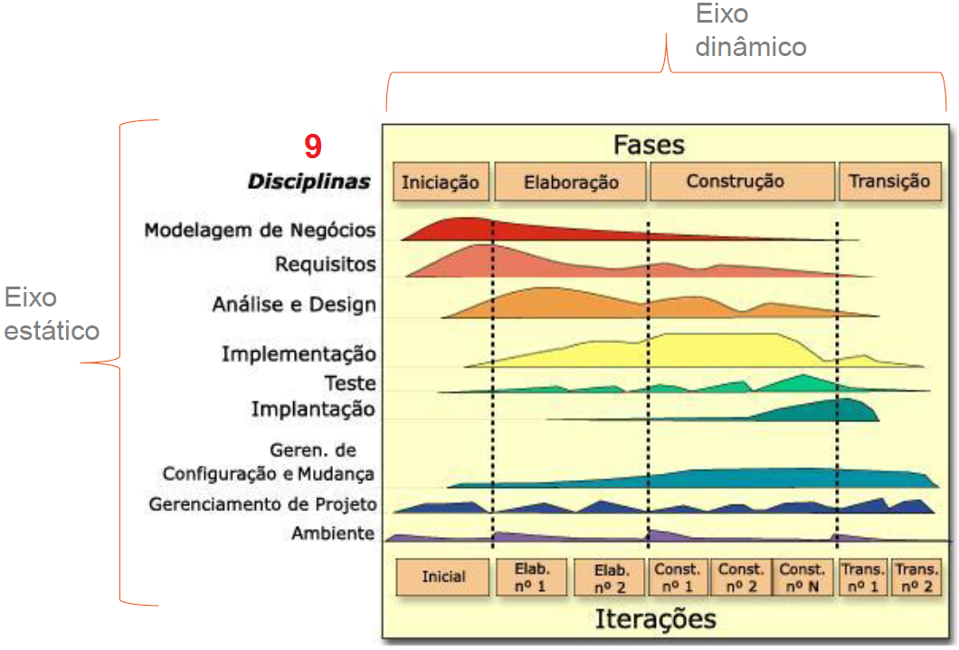 Disciplinas básicas: Modelagem de Negócios, Requisitos, Análise e projeto, Implementação, Testes, Implantação