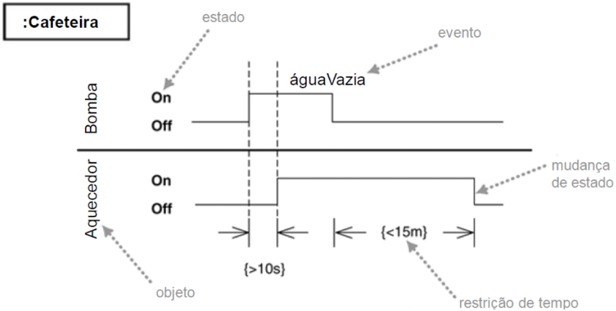 É igual ao diagrama de sequência + diagrama de máquina de estados. Foca nas restrições de tempo das interações.