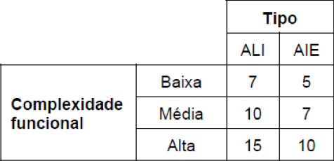 APF. Determinar o tamanho funcional de cada função de dados em relação a complexidade funcional (Baixa, Média, Alta) e tipo (ALI, AIE).