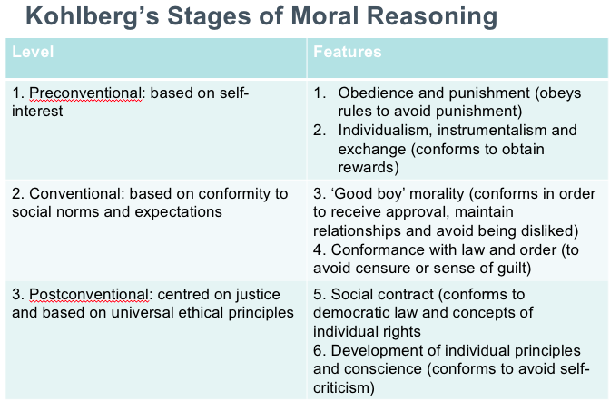 What are the 3 stages of Kohlbergs stages of moral reasoning?