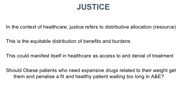 Justice –> In healthcare this means the distribution of resources correctly