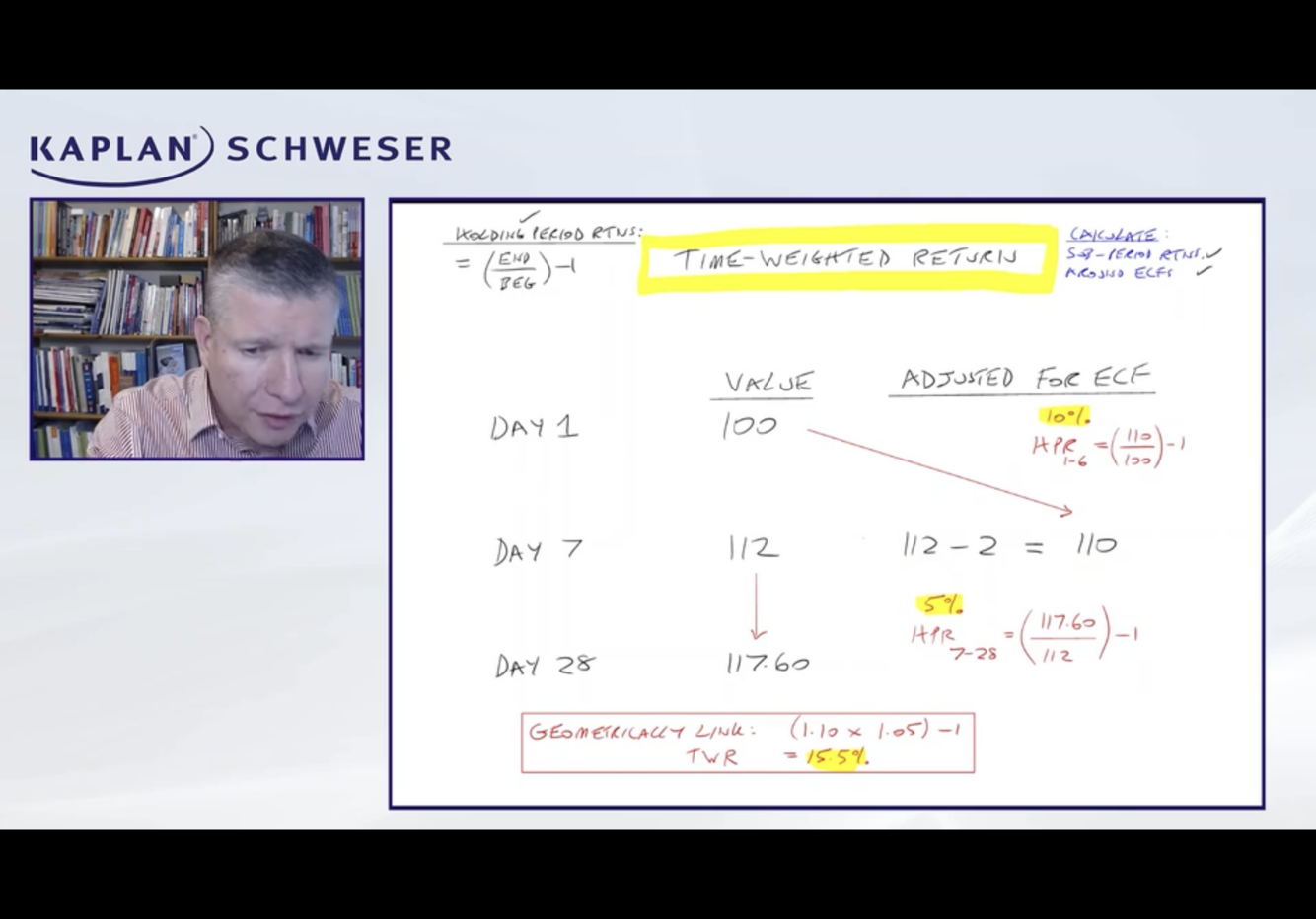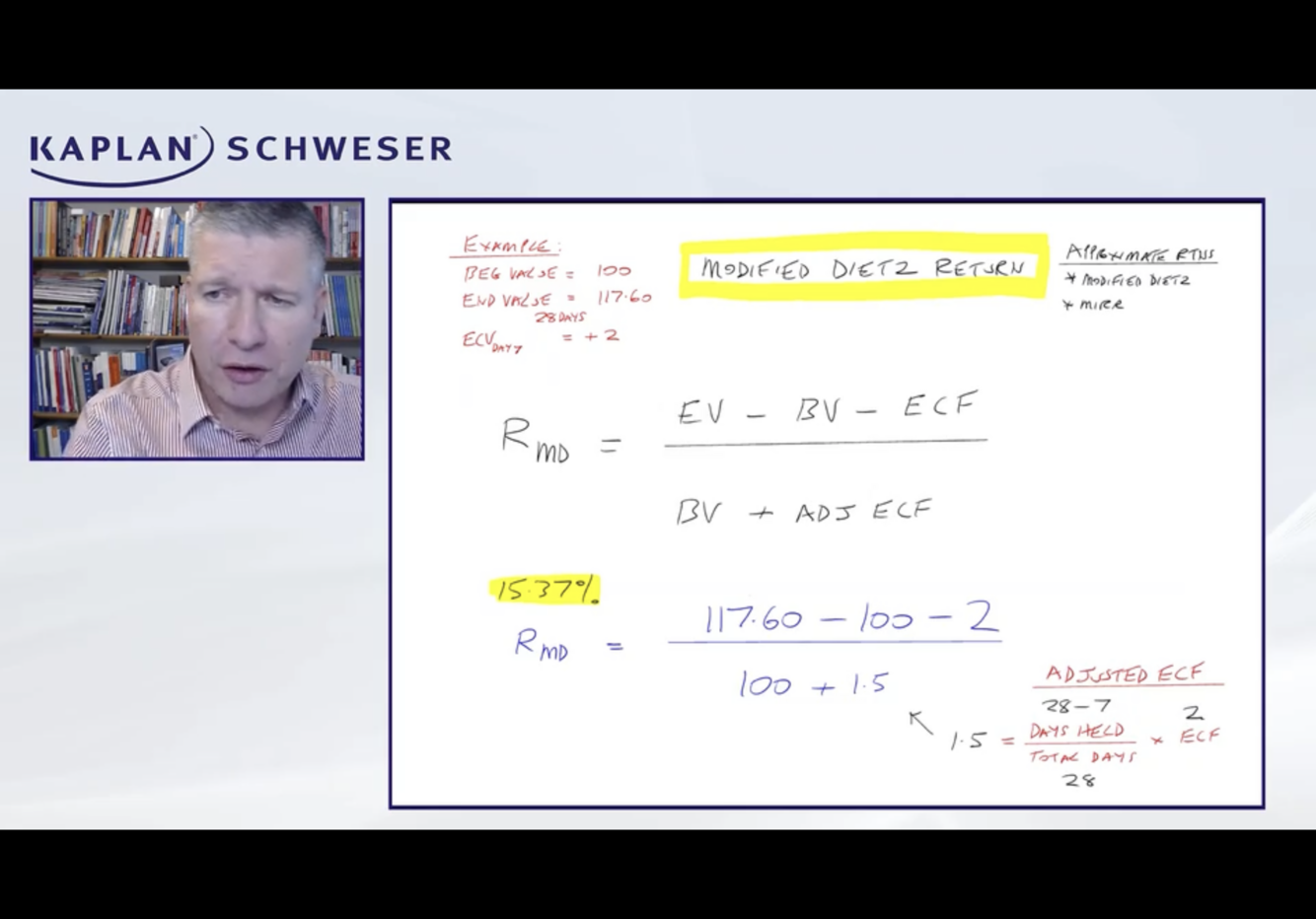 3) aggregate return method –> treat composite assets and ECF as relating to a single portfolio, then compute the Mod Dietz for this “mega portfolio”