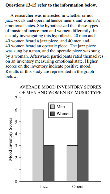 (A) Men who heard the jazz piece and women who heard the operatic piece scored higher on the mood inventory than those in the other two groups.