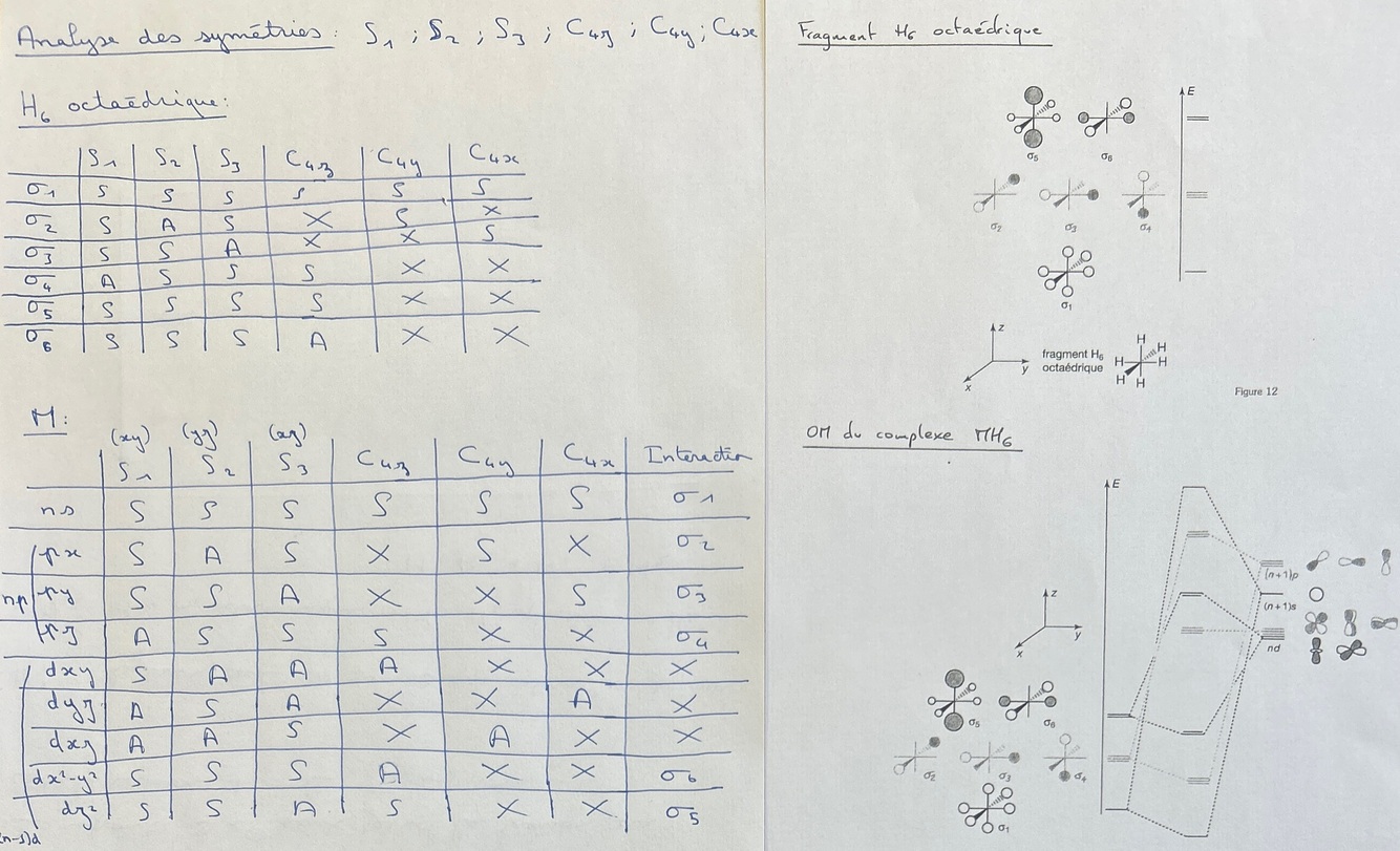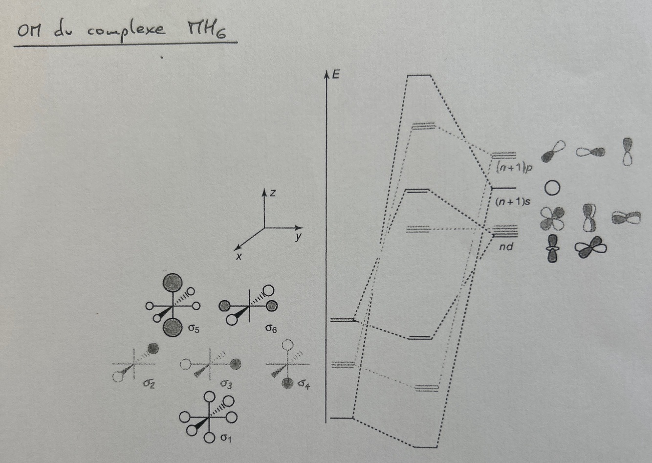 Pour un complexe octaédrique, un remplissage de 18 électrons correspond à aucune OM antiliante occupée et les 6 OM liantes et les 3 OM non liantes pleines