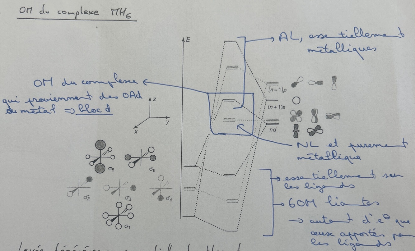 Les OA qui n’intéragissent pas sont celles du métal qui pointent entre les ligands (les 3 non liantes)