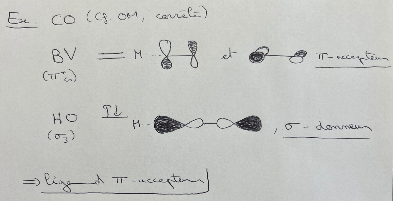 L apporte 2 électrons pour faire la liaison de coordination M — L. C’est une interaction de type σ entre la BV du métal (OA d) et la HO du ligand. On appelle ça une interaction σ - donneur.