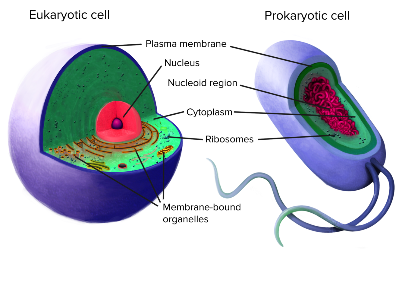 Prokaryotic cells are generally simpler and include bacterial species. Eukaryotes can range from single-celled organisms (like yeast) to complex animals (like humans).