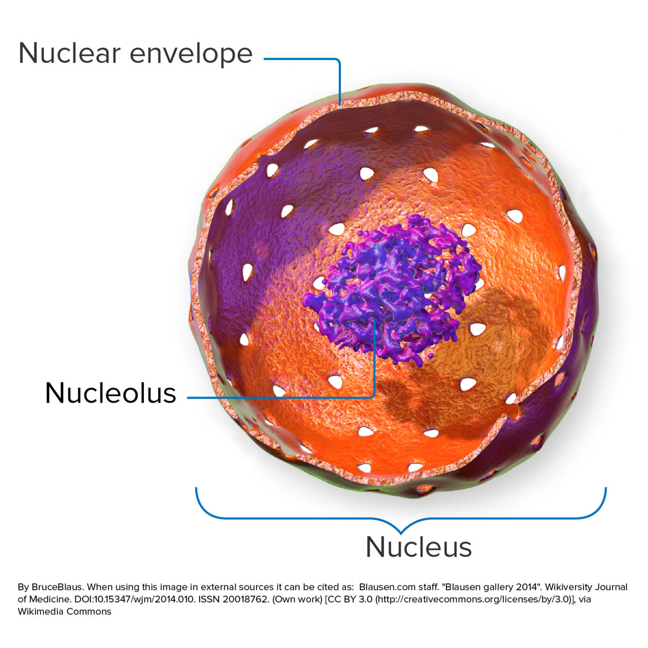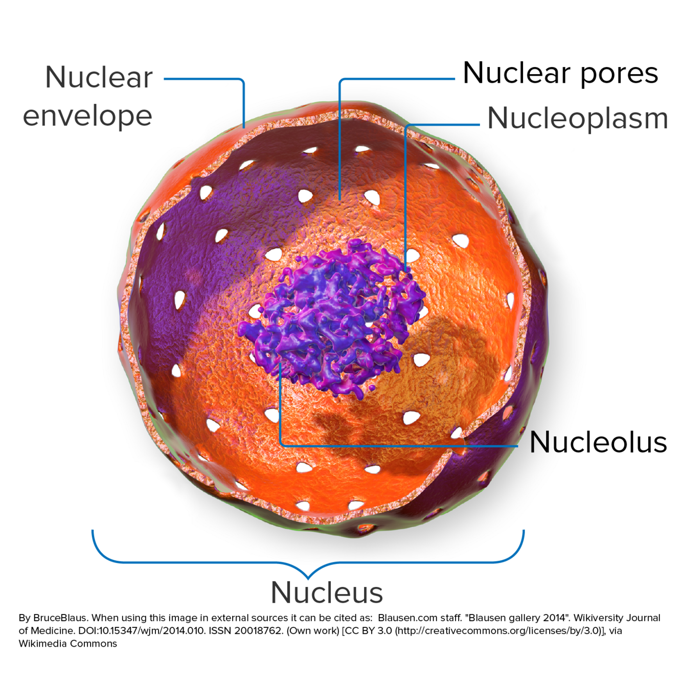 The nucleus is encased in a double membrane, known as the nuclear envelope. This membrane is marked by channels called nuclear pores. Inside, a fluid (the nucleoplasm) surrounds linear chromosomes.