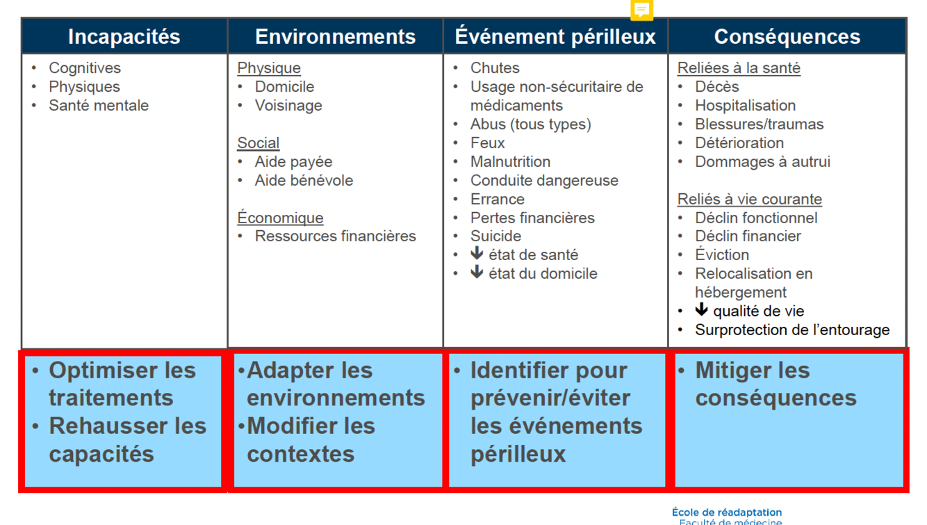 1. **L'impact** des troubles sur les habiletés fonctionnelle et la réalisation des habitudes de vie 2. La **sécurité** : les risques pour soi ou pour les autres 3. **L'évolution** des pertes fonctionnelles : en comparant avec le niveau fonctionnel antérieur!